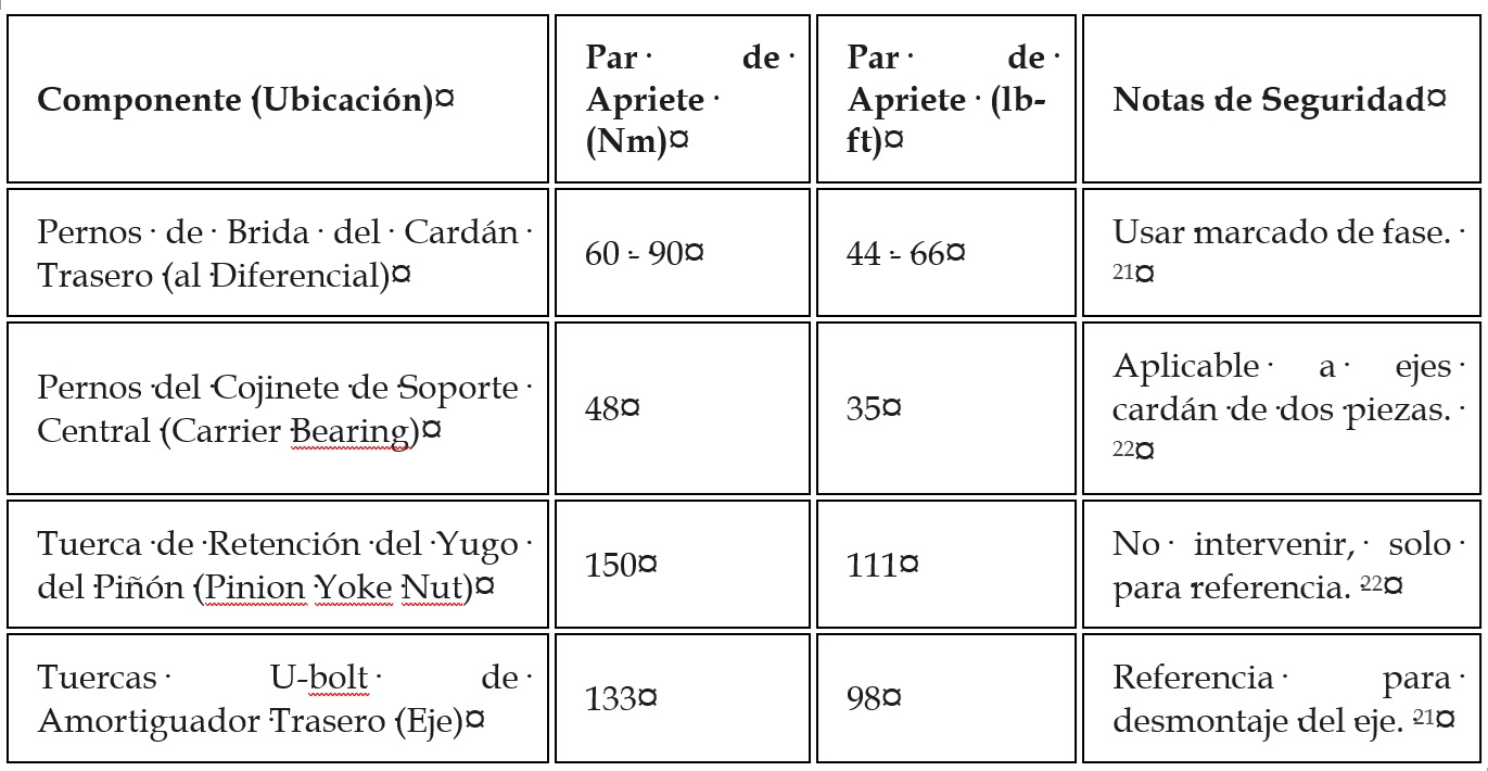 * Uso de Torque: Reinstalar los pernos del cardán y del cojinete central con una llave dinamométrica y aplicar los pares de apriete correctos (60–90 Nm para los pernos de brida).