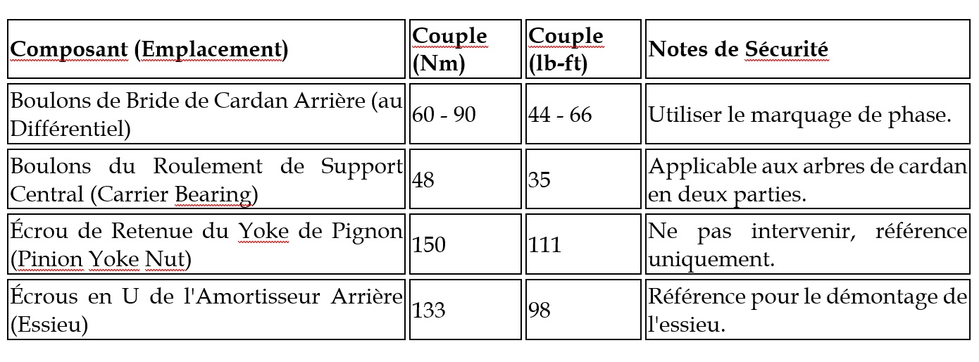 - Utilisation du Couple : Réinstaller les boulons de cardan et de roulement central avec une clé dynamométrique et appliquer les couples de serrage corrects (60–90 Nm pour les boulons de bride).